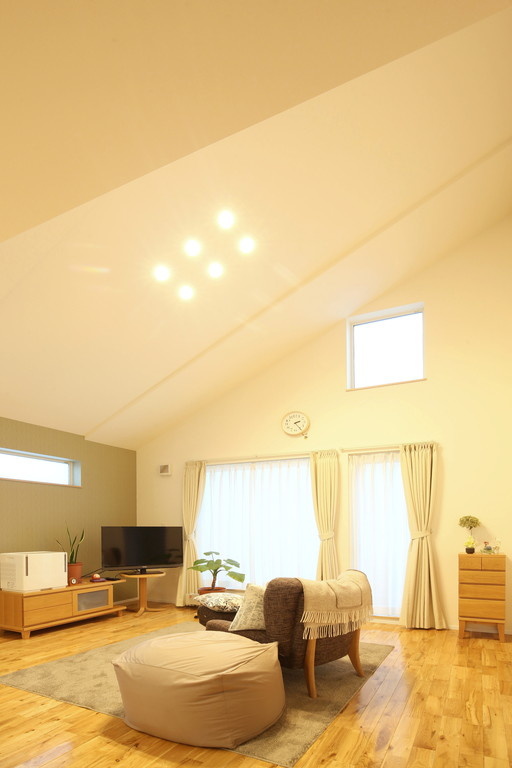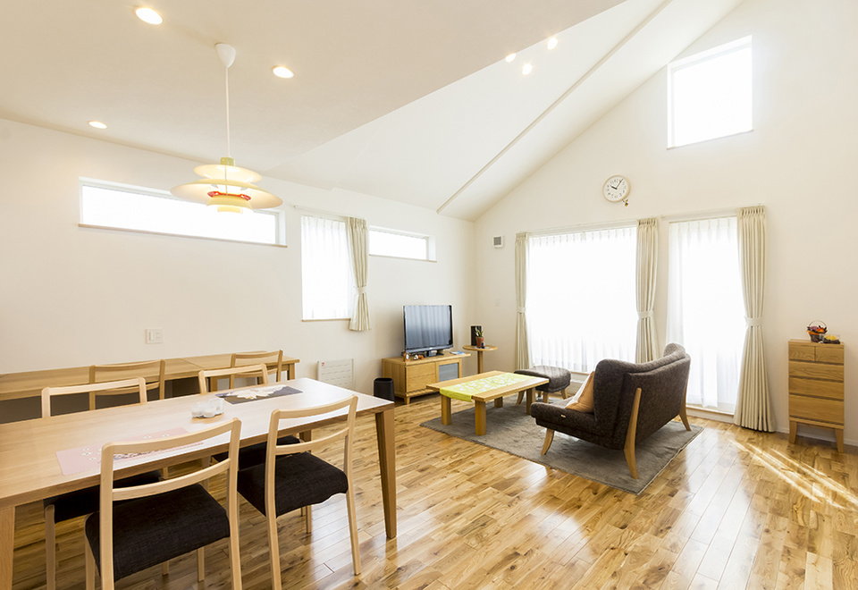 勾配屋根の形状を生かした吹抜けのリビングは10畳大。開放感溢れる空間で、実際よりも広く感じられます。ナラの無垢板を使った床には、掃除がしやすいようウレタンワックスを掛けています。