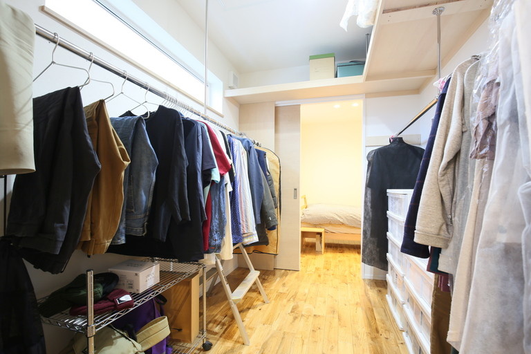 共働きのKさんご夫婦。洋服を畳んでしまう手間を省くため、ハンガーに掛ける収納方法をとっています。そのため、ハンガーパイプも多めに設置したそうです。