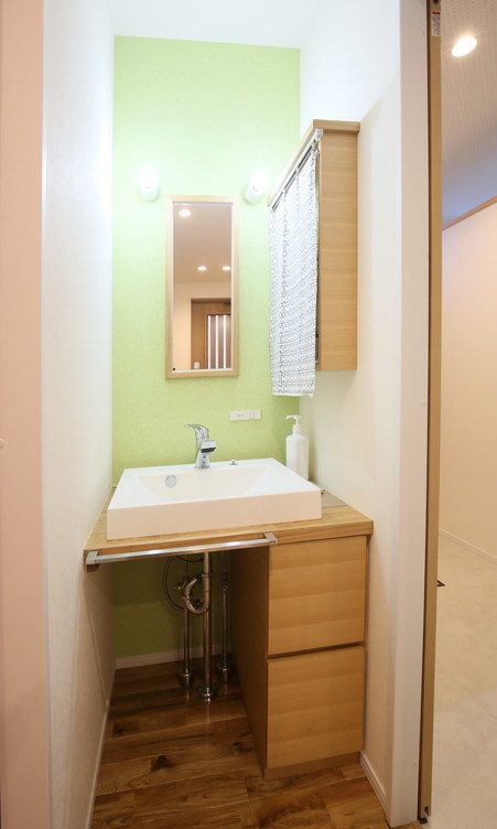 北欧テイストのシンプルな造作洗面化粧台。正面には明るいグリーンのアクセントクロスを使いました。左手にトイレ、右手にユーティリティーがあります。