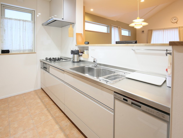 キッチンは通常サイズ(2.55m)よりも長い3m。食洗機も一番右端に設置してもらうなど、奥さまが一番こだわった場所です。