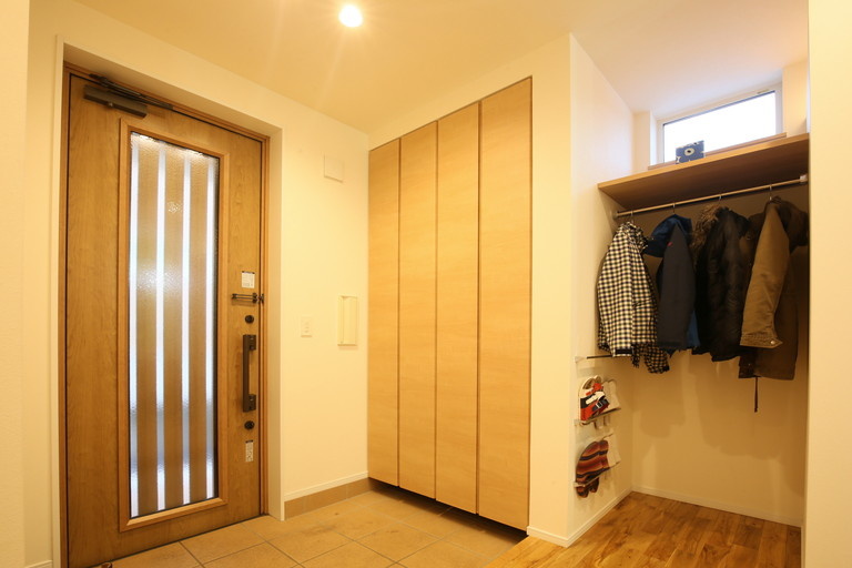 玄関には大型のシューズクローゼットを完備。採光窓の付いたコート掛けスペースも備えています。