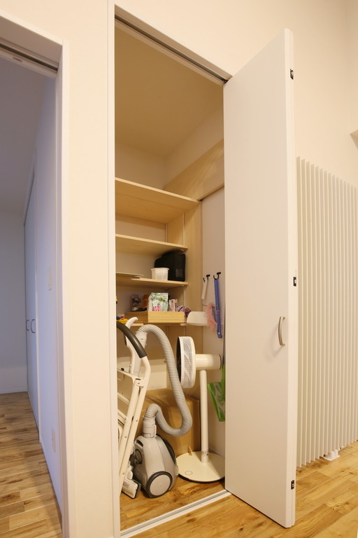 パントリーとは別に、リビングには掃除用具などを収めた収納も。ささっと取り出して気軽に掃除ができます。
