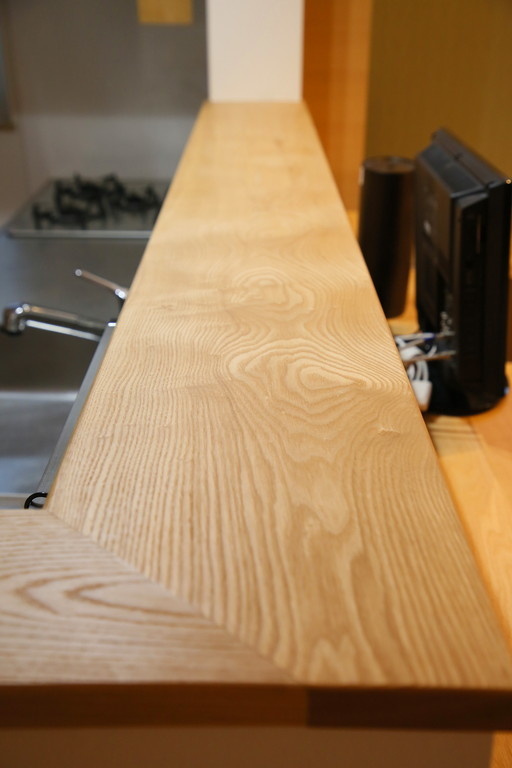 対面キッチンは、壁高を手元が隠れる高さにしました。天板にはタモの一枚板を使用しています。