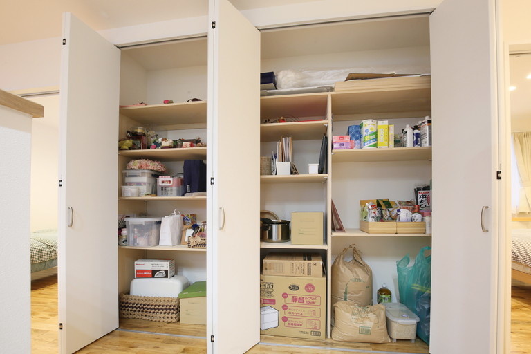 ウォークインクローゼットの背面には大型のパントリーを造りました。キッチンと通路を挟んだ場所にあり、とても使いやすそうです。