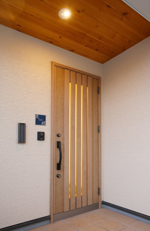 玄関ポーチの天井にはアカマツを採用。木質調のドアと相まって良い雰囲気です。