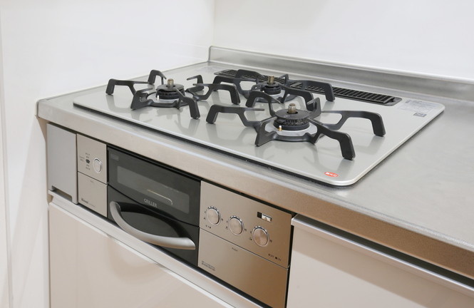 拭きやすく、デザインも良いフラットなガスレンジ。ボタン式のスイッチもお気に入りです。