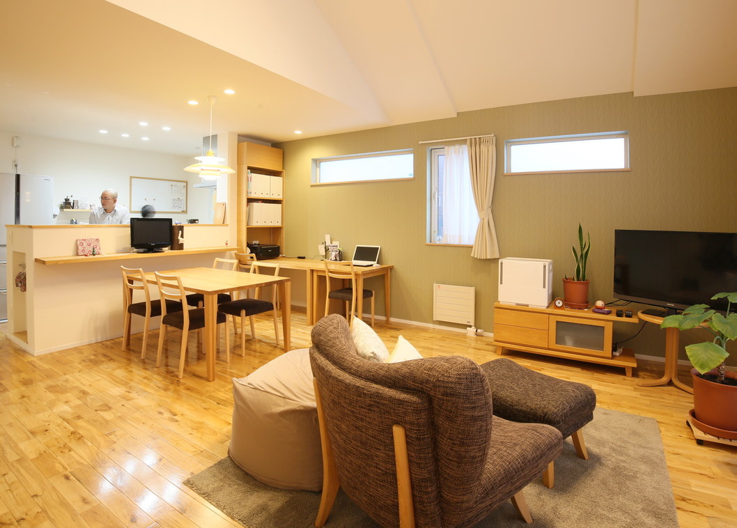 ダイニングの壁面には書斎スペースを希望。テーブルや椅子は東川の家具工房に制作依頼したオーダー家具で統一しています。キッチンの腰壁には食事をしがらテレビが楽しめるよう、カウンターも設置しています。
