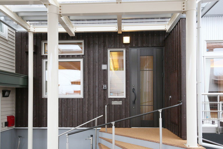 住宅の入り口は完全に分かれており、Fさん宅の玄関アプローチには、手すりを新たに設け、さらに段差を少なくした階段に、滑り止め効果の高いゴムチップタイルを使用しています。