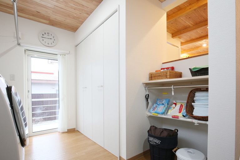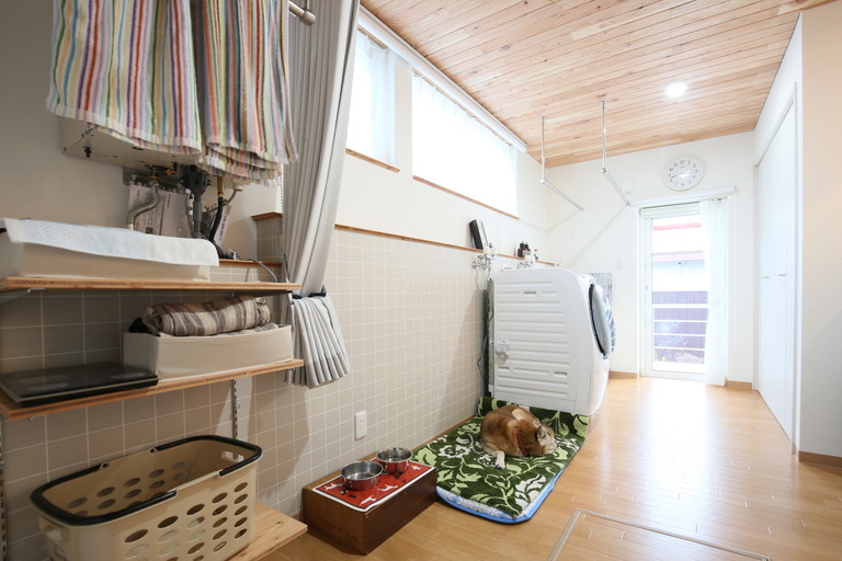 上)リビングから見て、キッチンの背面に位置するユーティリティーは、南側の勝手口にも通じる明るい空間です。7.5畳の広さがあり、愛犬「イチゴ」の餌台やトイレなどもここにあります。