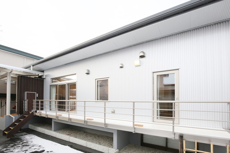 建物の南側には、外出が難しくなった愛犬「イチゴ」の運動用に、長いデッキをつくっています。