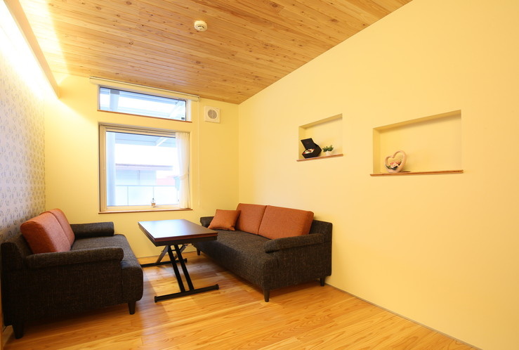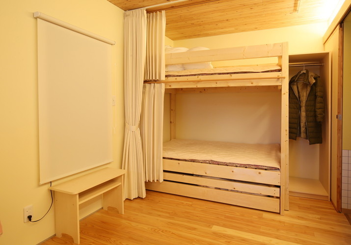 玄関ホール横の応接室は約13畳あり、南側の窓際には来客用の応接セットを置き、北側には2段ベッドと洋服掛けをつくりました。