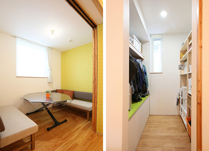 右)ダイニング横にあるウォークインクロゼット。左側衣服掛けはご主人の普段着収納。使い勝手を考え、ご主人の寝室からも戸1枚を挟んで、自由に出し入れできるよう配置しています。