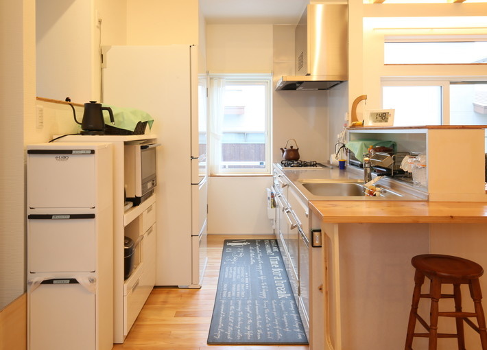 奥さまはキッチンのワークトップ前面に、奥行きが30cmあるカウンターを希望。中には食器の水切りラックや、トースターが収まっていて、キッチンはいつもキレイな状態が保たれています。