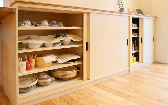 キッチンカウンターのリビング側には、カラマツの三層材を使用した食器収納も。こちらは来客時に使うものだけが収まっています。