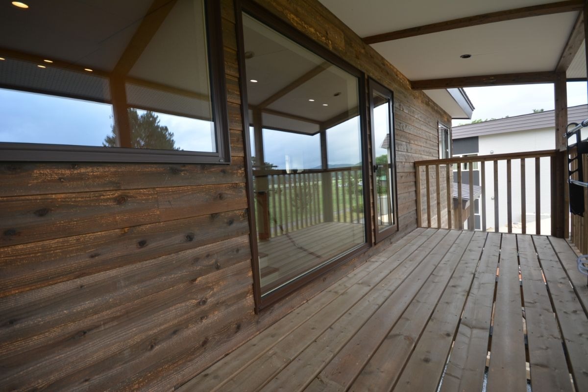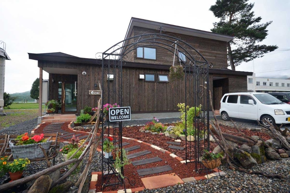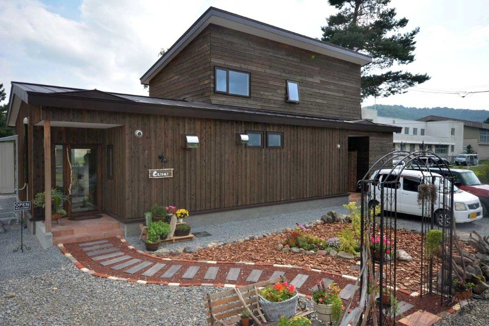 外観は全面道南杉の板張り。天気が良ければ、広いウッドデッキで食事もでき、ワンちゃんと一緒に食事もokです。