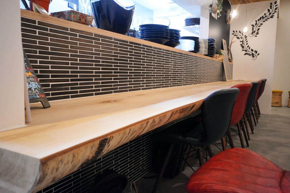 このお店の自慢の一つ。5.5メートルの大きなカウンターテーブルは