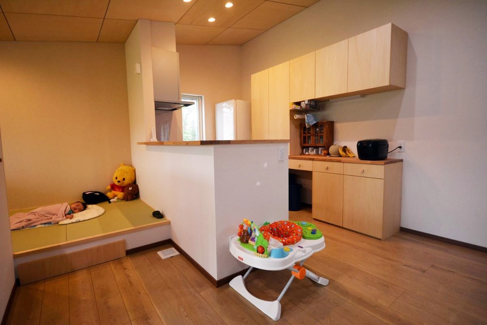 家事の最中も家族が赤ちゃんの様子をいつでも見守りやすいように、小上がりの空間を設けました。