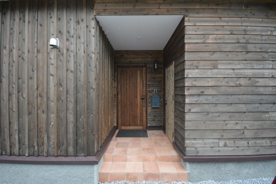 外装材が道南杉の板張り。木製の玄関ドアもとてもナチュラルな雰囲気です。