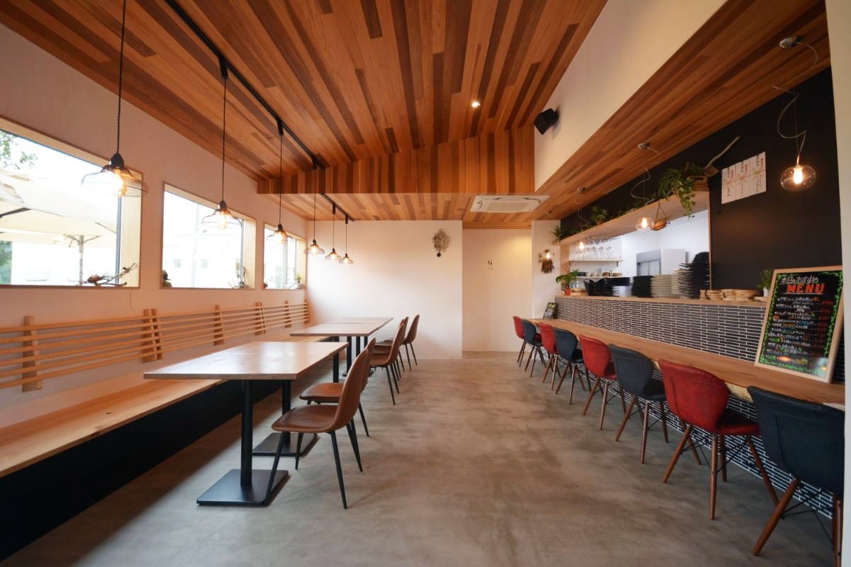 店内の天井はウェスタンレッドシダーの板張り。板張りのラインが、カウンター、ベンチと同じ方向で空間自体をシャープに見せています。
