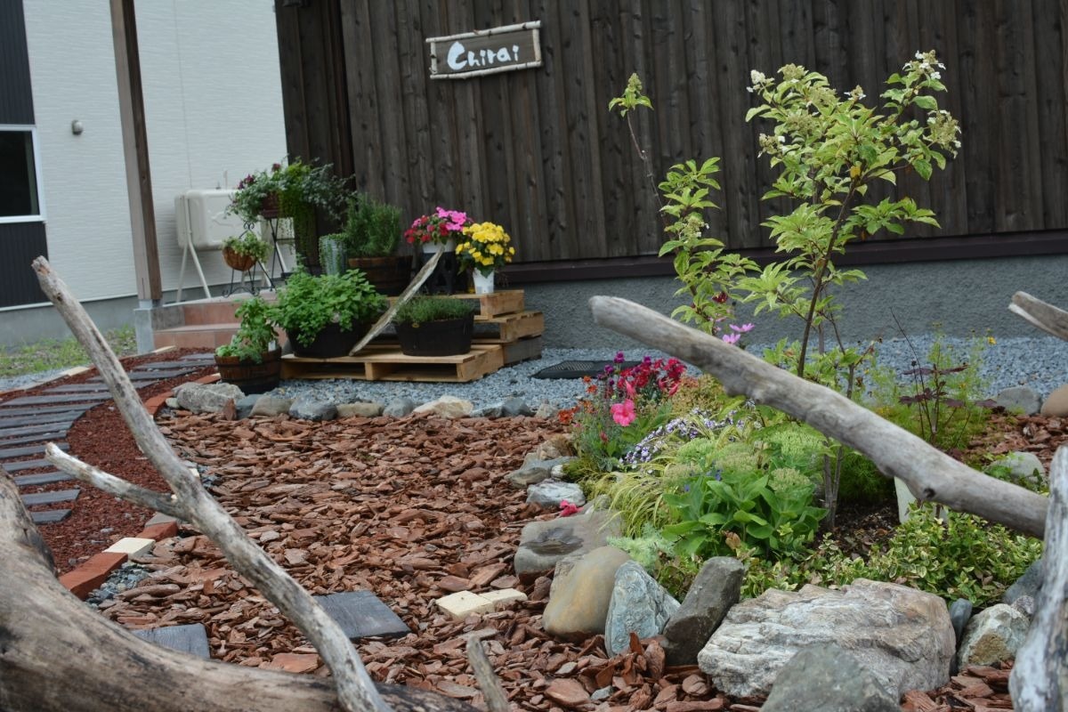 エントランス前には川で採取した流木もあってナチュラルな雰囲気です。