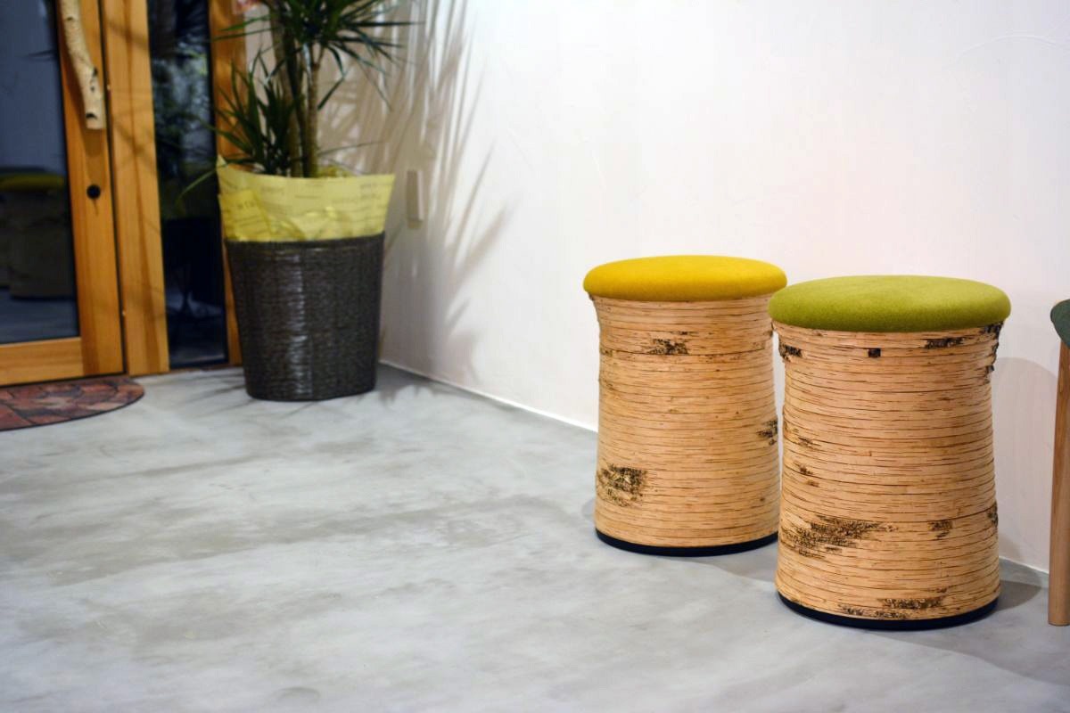 店内に入るとすぐの場所に、白樺の樹皮を活かしたスツールが。思わず座ってみる人が続出。