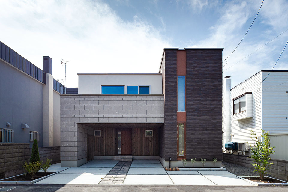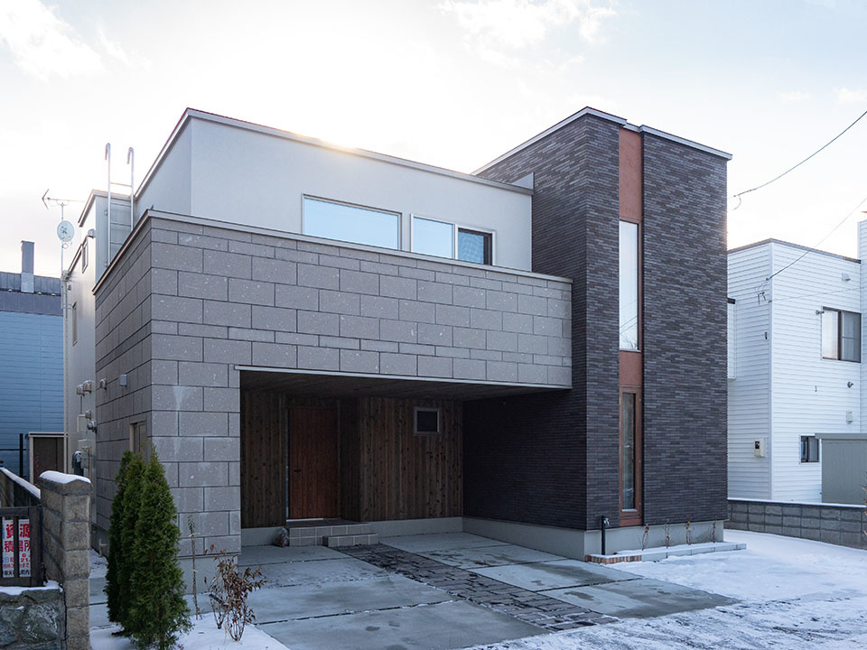 札幌軟石、道南杉、タイル、塗り壁と素材を使い分けたOさん邸。端正なたたずまいで、周囲の環境にも馴染んでいます。SE構法により大胆なオーバーハング(2階の床が1階よりもせり出している)を実現し、玄関前は屋根付きの駐車スペースとして活用しています。道路までのアプローチは暖房の排熱を使ったロードヒーティング。これまで捨てていた熱エネルギーをリサイクルし雪を融かす、とってもエコな装置です。