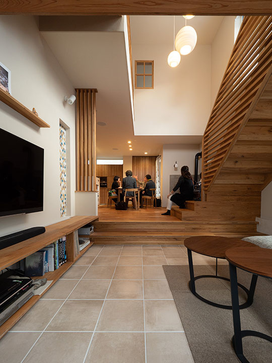リビング側からダイニングキッチンを見たところ。スキップフロアで段差をつけています。こちらの床はタイルですが、Oさん邸はコンクリート基礎部分に温水配管を回した床暖房により、穏やかで快適な環境を保っています。