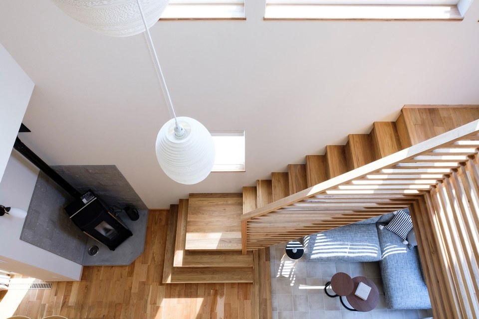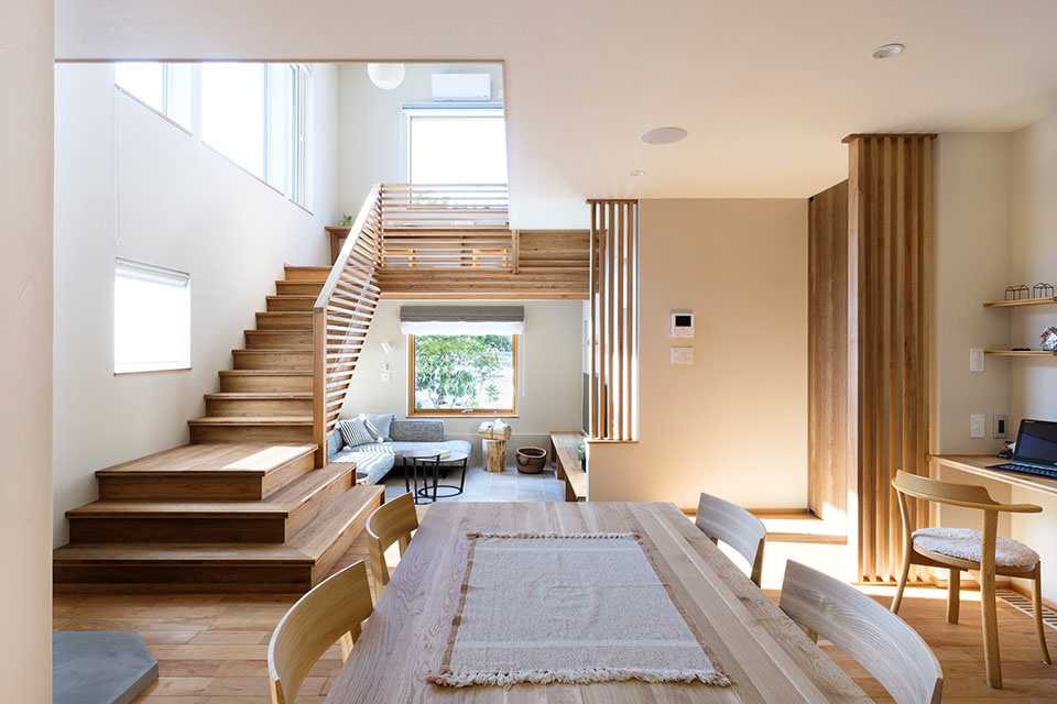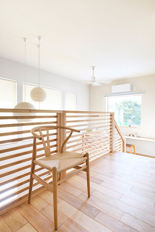 階段は通常の約1.5倍という横幅でゆとりを確保。また、1階に降りていく3段分の踏み板は、ほぼ正方形で何人かが腰掛けることもできます。「リビングのソファやダイニングのチェア、階段など、LDKの中でみんなが思い思いの場所に座ってくつろいでいます。程よい距離感がいいのか、ソファに固まって座っていた頃よりも、家族のおしゃべりが増えましたね」とご主人。