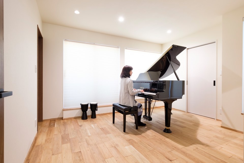 2階の音楽室。それぞれが得意な楽器を持つOさんファミリーは楽器の収納庫も造っている