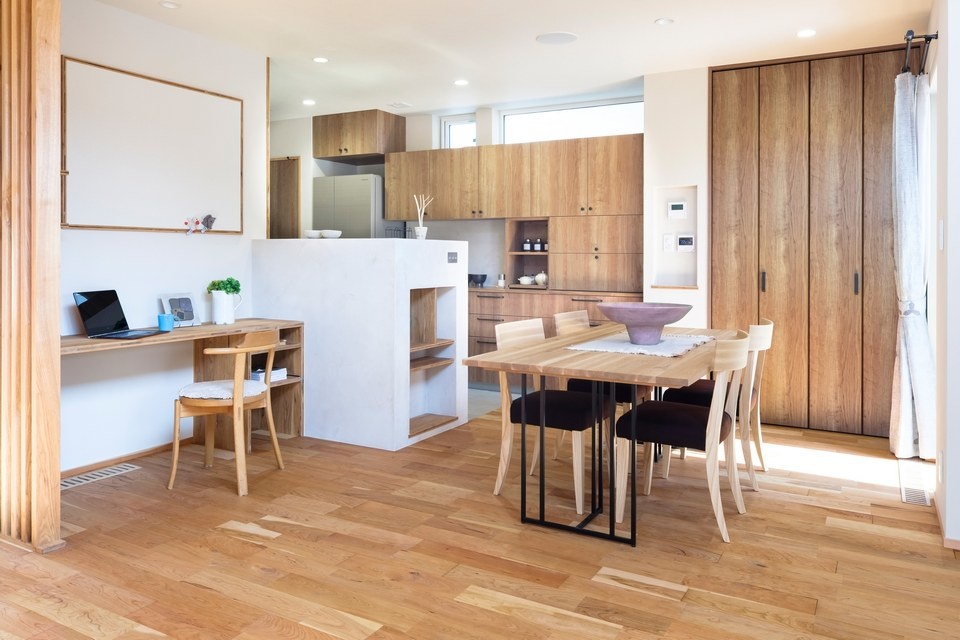 キッチンカウンターの造作も、奥さまのお気に入りです。「来客時に、キッチンのゴチャゴチャしたところは見せたくなかったんです」。そこで、シノザキさんと相談の上、ダイニング側からは見えにくい高さのカウンターを造作。前面には収納などを設けました。「朝はお弁当を3つ作るので、カウンターに並べて置けるのが助かっています」。ほかのところでも、シノザキさんは細かいところまでよく聞いてくれて、使いやすいようにデザインをしてくれたそうです。