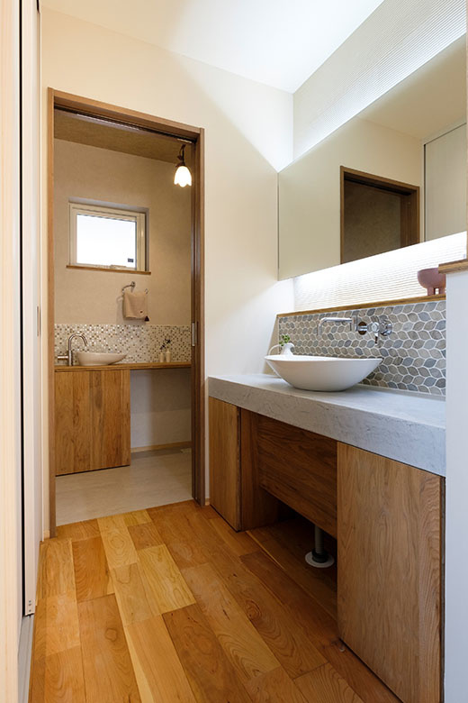 写真の1階洗面コーナーは、来客を意識したつくり。2階は完全にファミリーの空間として、独立した洗面室とバスルーム、トイレ、ユーティリティーを設けました。フローリングは主にウォルナットの無垢材を使い、1階でも使っている道産ゼオライトの白い塗り壁や淡いカラーのクロスを合わせています。