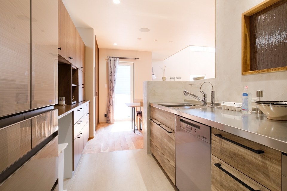 キッチンの奥からダイニング側を見ると、こんな感じです。収納もたっぷりでスマートにおさまり、動きやすく物も出し入れしやすい。冬場には冷気を保つ断熱食品庫も活躍しています。