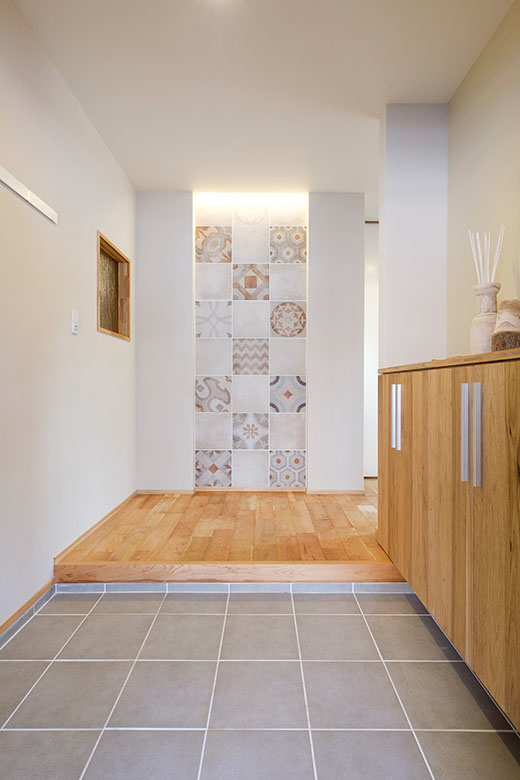 玄関ドアを開けると、名古屋モザイクのアクセントウォールが迎えてくれます。右側シューズボックス上の壁は珪藻土塗り壁、左側には収納力たっぷりのシューズクロークがあります。内装はシノザキ建築事務所のインテリアコーディネーター、篠崎正子さんが奥さまと相談しながら決めていきました。