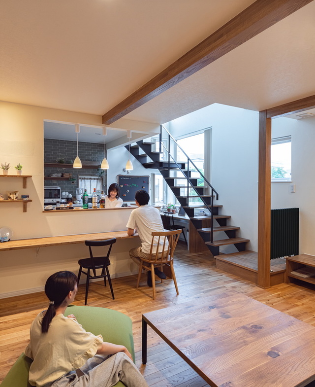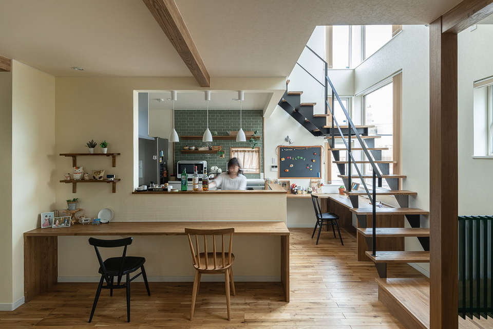 キッチンは、コーナーに配した大きな窓から光が降り注ぐ、明るい空間になりました。リズミカルなスケルトン階段が視線を上にも誘い、空間に広がりを感じさせます。