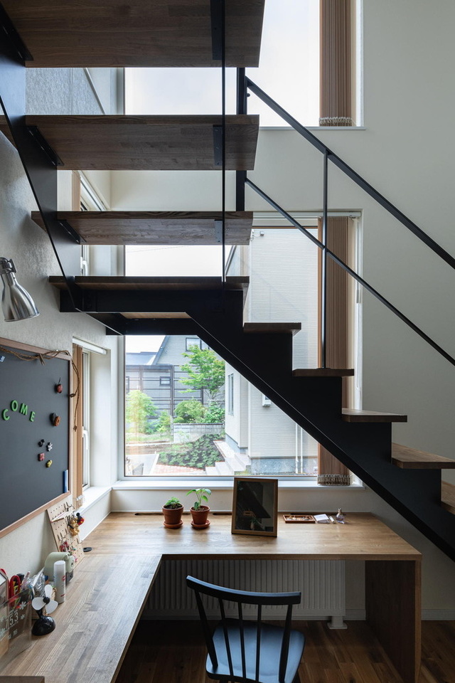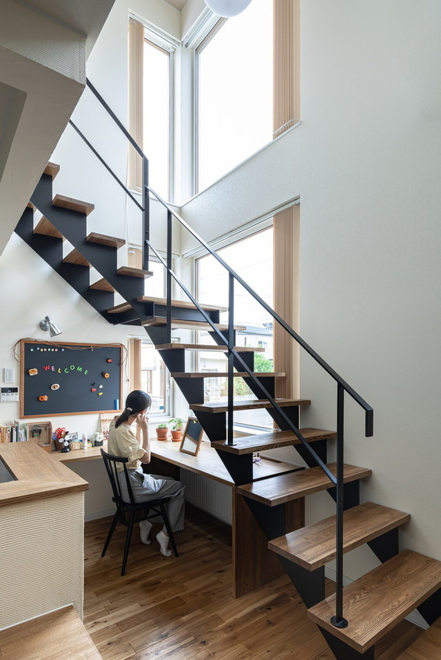 スケルトン階段の下にはL字型にカウンターを設置。短大生の娘さんは、毎朝ここで身支度をしています。窓からの自然光がメイクにも最適です。