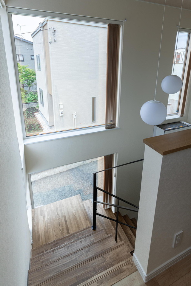 札幌市内の閑静な住宅街にKさんのお宅はあります。新居は、成長した子どもたちと快適に暮らすことができる生活動線や、吹き抜け階段を活かした、開放的で遊び心あふれる空間設計が魅力です。