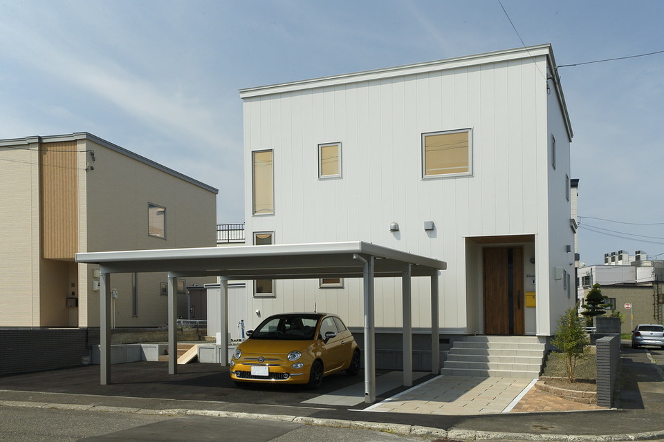 総2階のキュービックな形は、熱損失を抑える上でも有利。広めに確保した駐車スペースには、2台分のカーポートが付いています。
