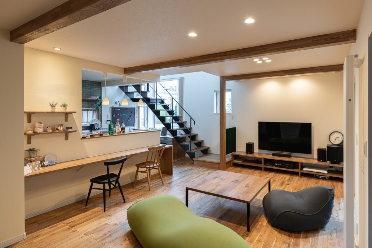 ダイニング・スペースをとらなかった分、広く確保できたリビングは、家族が思い思いに寛げるゆとりある空間になりました。