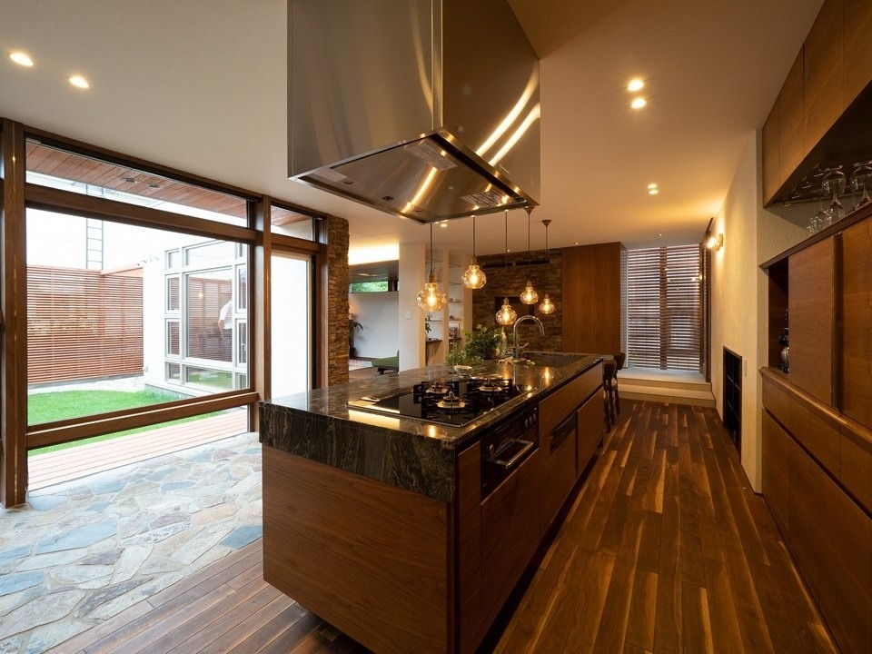 造作による豪華なリビングドアを抜けると、ダイニング・キッチンが広がっています。照明計画も老川さんによるもの。間接照明やガラスのペンダントライトがムーディーでラグジュアリーな空間を演出しています。