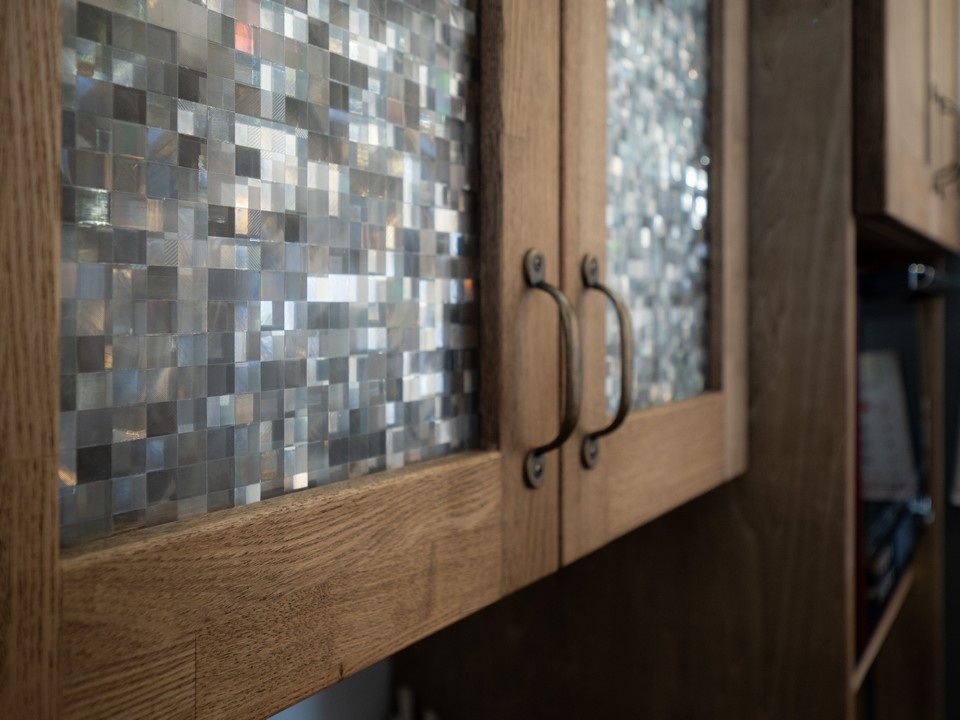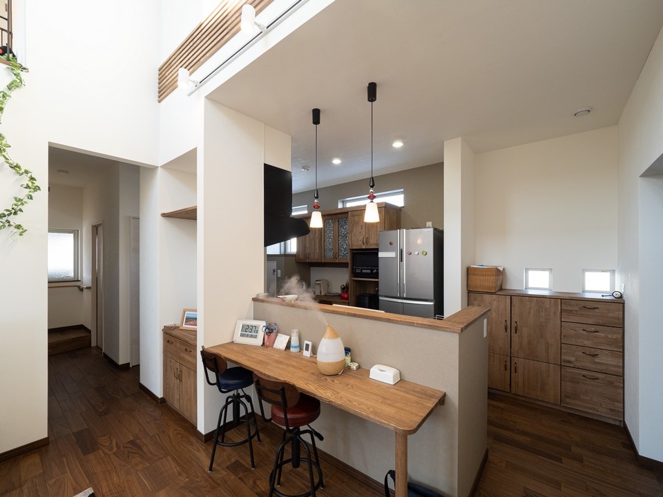 「食事は、造作したキッチンカウンターで取ることが多いです」と奥さま。2人暮らしなのでその方が片付けも楽で使いやすいそう。キッチン収納も、プラスワイドで造作しました。レトロなチェッカーガラスを使った食器棚は、炊飯器や電子レンジを便利に収納できるスライド棚付き。棚の下は引き出し式で分別ゴミ箱を4個収納しています。造作家具は、タモ材の集成材を使用。