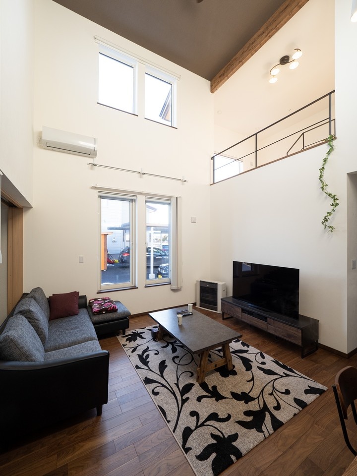 M邸では、壁の断熱は140mm厚のグラスウールに付加断熱として30mmの高性能断熱板、天井は400mm厚の吹き込み断熱材を採用。断熱性能を表すUA値は0.28Wと国の省エネ基準0.46Wや、北海道が今年からスタートさせる高性能住宅の基準『北方型住宅2020』0.34Wを大きく上回る高断熱住宅です。延床面積が30坪(約100m2)以上ある住宅ですが、暖房はガスFFストーブ1台だけ。断熱性能が高いため、暖房機器のパワーを必要としないからです。リビングの天井にはサーキュレーターがあり、暖かい空気が家全体に循環しやすいよう配慮。また、オープンな間取りなので家中どこでも暖かいそうです。