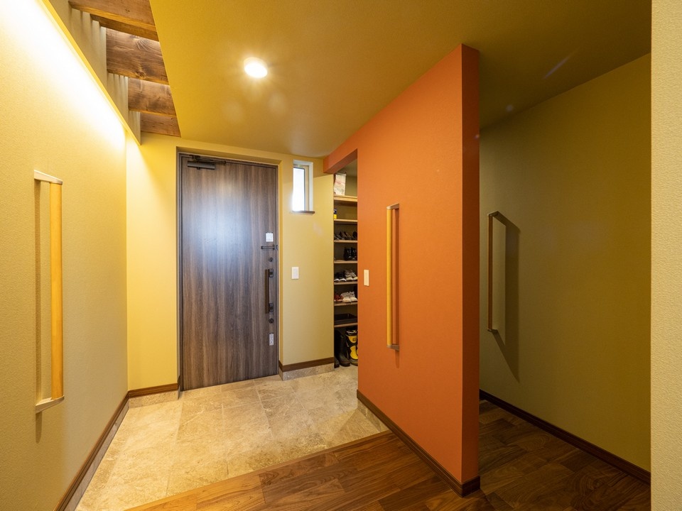 玄関を入ると左横にシューズクローゼットがあり、リビングに入る動線が2つに分かれています。お客様は正面を進み、ご夫婦はシューズクローゼット側から入ります。玄関には明かり取りの吹き抜け!?