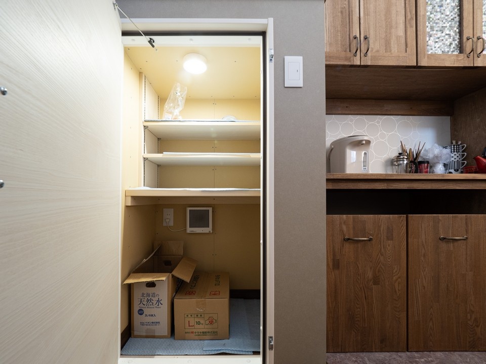 窓の下にある白い扉が食品庫。両脇の壁にも収納がある