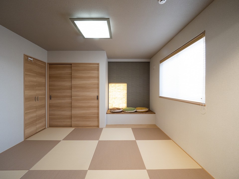 リビングに隣接する和室は、市松模様のフチなし畳にベンチ収納がカジュアルな雰囲気。洋間のリビングとひとつづきに使っても違和感ありません。