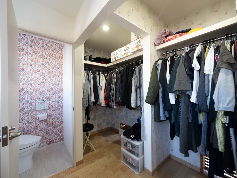 寝室はさらに階段を少し上ったところにあります。ユニークなのは、寝室奥にあるウォークインクローゼット。なんと、トイレがクローゼットの中にあります。プライベートトイレという感じです。クロスの色も少しビビッドな柄を選んでいます。
