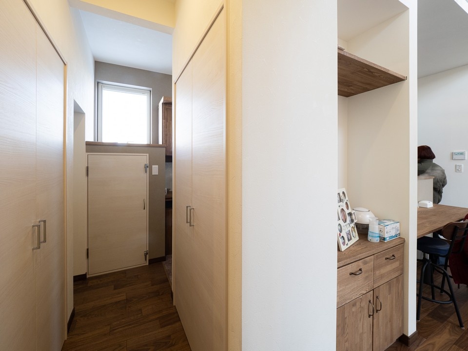 キッチンは希望通り回遊式動線になっています。玄関ホールを直進すると、両脇の壁に収納があり、突き当たりが食品庫。野菜やビール缶などはこちらにストックできます。さらに右に回ればキッチンです。