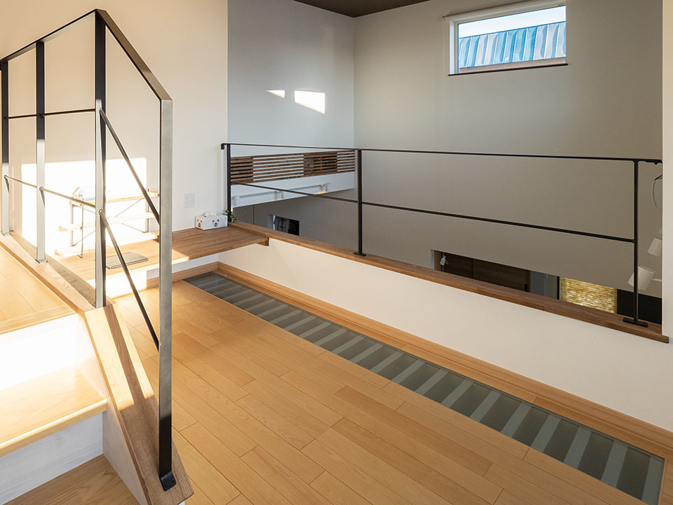 「いえいえ、これは吹き抜けではなく、中2階の床を一部透明にしているんです」と清水社長。十勝は大地震が起きやすい地域。吹き抜けを必要以上に大きく取ることなく耐震性を確保し、明るく開放感のある家を実現するための工夫です。