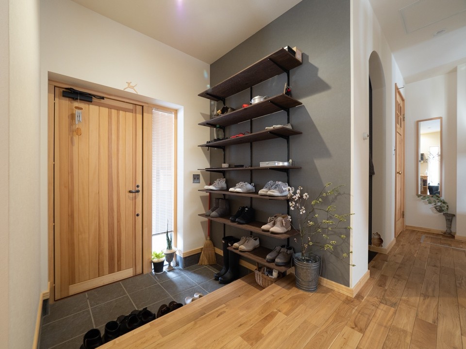 グレーのアクセントクロスに、春を感じさせる花木のアレンジがよく映え、「見せる収納」が楽しい玄関。右奥の左手にある鍵付きのドアは共有のボイラー室への出入り口で、親世帯につながっています。