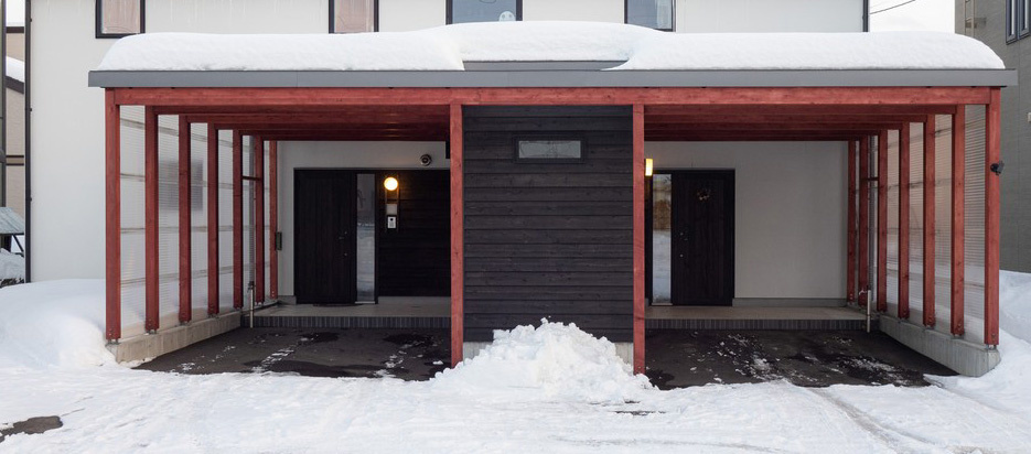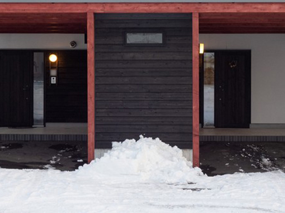 向かって右の玄関がAさんの住居です。外壁にはたい耐候性と意匠性の高いジョリパッド(塗壁)を、雪で隠れていますが、屋根にはガルバリウム鋼板を使っています。