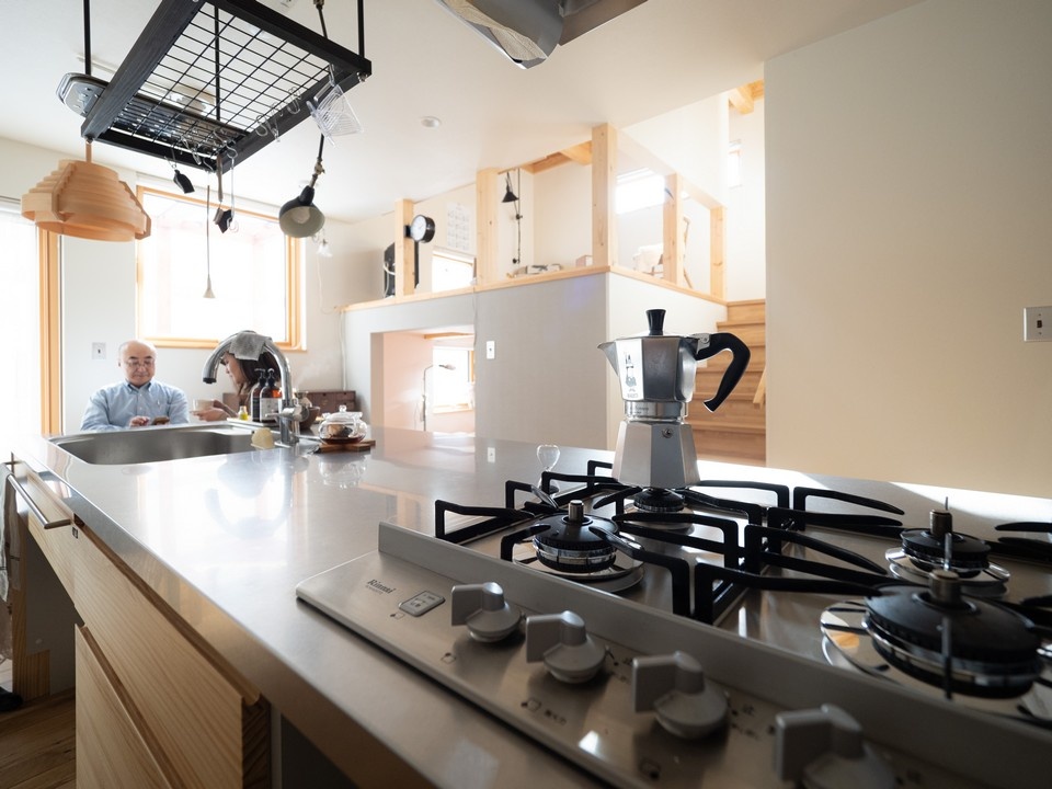 LDKはキッチンがメイン。背面のハイサイドライト(高窓)の向こうには親世帯のLDKがあり、互いの気配が緩やかに感じられる造りです。